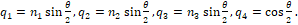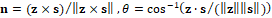 According to LL and referring to figure 3, the orientation of the eye from the primary position, pointing in the direction of the unit vector z, to a position where the eye is looking at, pointing in the direction of the unit vector s, is achieved by a rotation an angle θ about the unit axis vector n perpendicular to both, the primary position z and the gaze direction s. This rotation can be described by a quaternion q as previously discussed. Considering the eyeball a rigid body, all of its points must perform the same rotation represented by q, including the insertion point of each EOM on the globe.