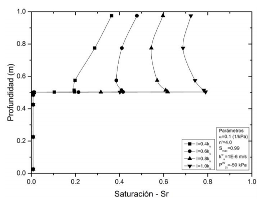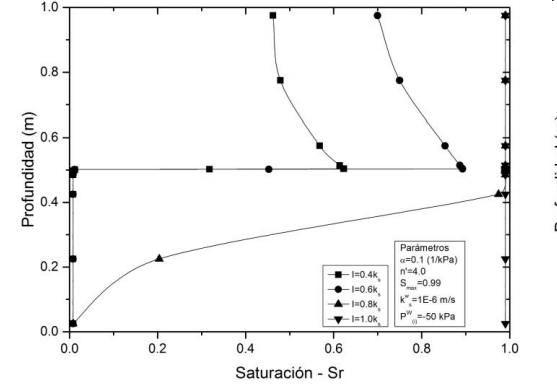 En contraste con lo ocurrido en la hora 45, en el tiempo 80 se alcanza a romper la barrera capilar durante las mayores intensidades (I=0.8kWS y I=kWS), tal como se muestra en la Fig. 9. Para estas intensidades los elementos inferiores presentan un incremento en el grado de saturación. De este modo para el escenario propuesto de intensidad de lluvia igual a la permeabilidad saturada (I=kWS); el sistema suelo-geosintético presenta una condición de presiones de poros cercanas a cero como efecto de superar el “tapón” generado por el geosintético y la mayor cantidad de agua que permite la acumulación de agua en los elementos superiores. Sin embargo, para los casos de I=0.4kWS y I=0.6kWS no se vence la barrera capilar, debido a que los elementos por encima del geotextil no han reducido la succión matricial en los niveles necesarios (cercanos a cero) para que el geosintético facilite el drenaje, presentando unas saturaciones aproximadas de 0.9 y 0.6 para I=0.6kWS y I=0.4kWS, respectivamente, en el elemento cercano al geosintético.