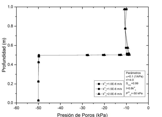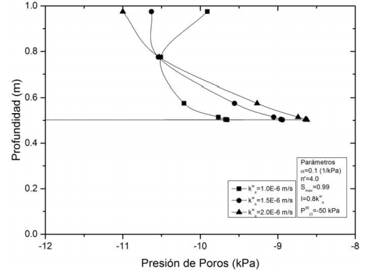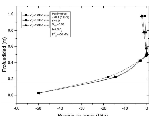 Con el fin de analizar la influencia de las propiedades hidráulicas de los materiales en el rendimiento de la barrera capilar, en las Fig. 10 y 11 se muestran las variaciones de la presión de poros para permeabilidades de kWS =1x10-6, 1.5x10-6 y 2x10-6 m/s, y sujetas a una lluvia constante de I=2.88 mm/h y una presión de poros inicial de -50 kPa.