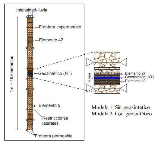 Recientemente, Thuo et al. [13] empleó modelos numéricos en 2 dimensiones, con el uso de elementos finitos para simular el efecto de la barrera capilar, observando que para taludes no saturados reforzados con geotextil no tejido, éstos actúan como una barrera de humedad en lugar de actuar como un material drenante, desarrollando presiones de poros positivas en el suelo inmediatamente por encima del geotextil. Jana et al. [14] modeló mediante elementos finitos un flujo transitorio similar al presentado por Thuo et al. [13], con el fin de modelar la respuesta de muros de suelo reforzado con geosintético no tejido con suelo fino sujeto a lluvia de infiltración. Ellos observaron que la conductividad hidráulica del geotextil se ve reducida dentro de altos niveles de succión, impidiendo el flujo de infiltración, y de esta manera reduciendo de esta manera la resistencia del suelo ubicado por encima del geotextil, resaltando que: “el uso de los geotextiles no tejidos requiere una investigación critica adicional” [p.11].