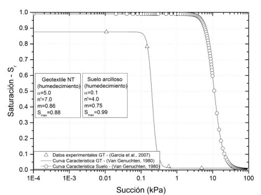 Estos resultados son acordes a los previstos para cada material según su respectiva curva de retención de agua (SWCC, Fig. 2). Para el geosintético se observa que, en altos niveles de succión, el grado de saturación es muy bajo y solamente para succiones menores a 1 kPa es cuando empieza a aumentar el contenido de agua en sus poros. También se observa el pequeño rango que presenta para pasar de bajos porcentajes de saturación a la saturación máxima (Smax=0.88) a partir de su elevada pendiente en la zona de transición, razón por la cual el cambio de la condición seca a saturada es casi de manera instantánea; por lo tanto, se infiere que el geosintético solo trabaja como material permeable en bajos rangos de succión, trayendo consigo el efecto de retención de agua cuando interactúa con suelos parcialmente saturados.