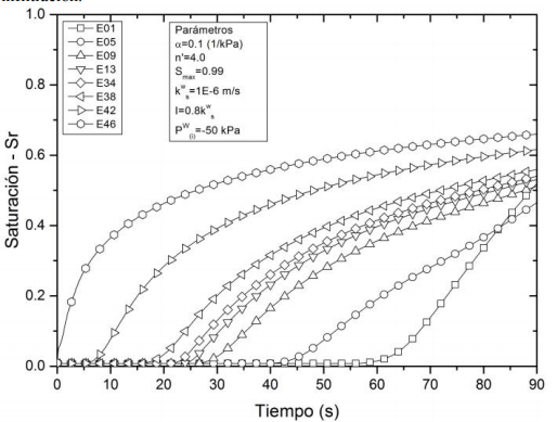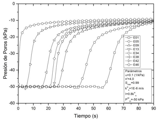 Posteriormente, en la hora 80 aproximadamente, se observa que los elementos presentan presiones de poros cercanas a los -10kPa, mostrando que los elementos no se alcanzan a saturar completamente bajo las condiciones asumidas de lluvia. Esta respuesta es consistente con los resultados de la Fig. 4 donde se muestra la variación temporal de la saturación, en la cual ningún elemento alcanza un grado de saturación mayor a 0.7 del volumen de poros disponible en cada elemento, se infiere un proceso de infiltración continuo y permanente a través de todos los elementos de la columna.