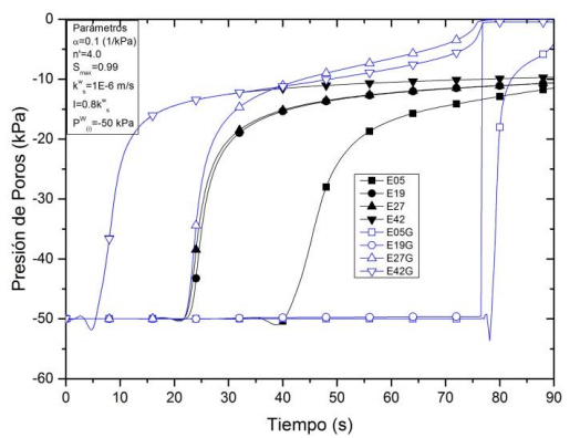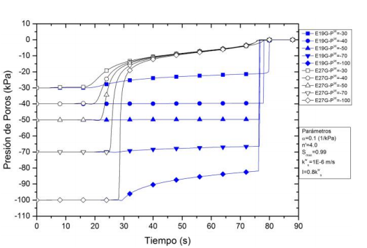 En la Fig. 7 se presentan las distribuciones de la presión de poros correspondiente a los elementos E19G (Bajo el geosintético) y E27G (sobre el geosintético) del Modelo 2 bajo distintos valores presión de poros inicial (-100, -70, -50, -40 y -30 kPa). De la Fig. 7, se puede observar que el incremento en la presión de poros (disminución de la succión) inicia en menor tiempo bajo el escenario de presión de poros inicial igual a -30kPa, ocurriendo antes de la hora 20. Por otra parte, el elemento que tardó más tiempo para iniciar su proceso de acumulación de agua por encima del geosintético fue el de presión de poros igual a -100 kPa (E27G), iniciando a las 28 horas aproximadamente. Por consiguiente, a medida que la presión de poros inicial establecida fue mayor (-100 kPa < -30 kPa) la concentración de agua en los elementos por encima del geomaterial se presentó de forma más rápida; en donde inicialmente el sistema suelo-geosintético con mayor succión (bajos niveles de presión de poros) otorga menos caminos disponibles para el flujo a través del geomaterial [8].