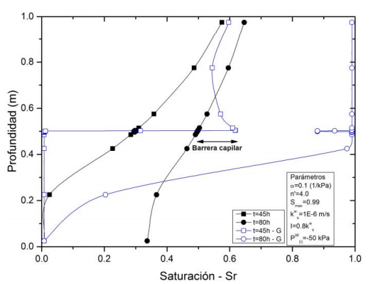 El comportamiento mostrado anteriormente, también se puede explicar a partir de la Fig. 6, en la cual se muestra la variación espacial del grado de saturación a través de la columna para los tiempos de infiltración t=45 y 80 h, respectivamente, representando de manera más evidente la acumulación de agua en los elementos adyacentes por encima del geosintético.