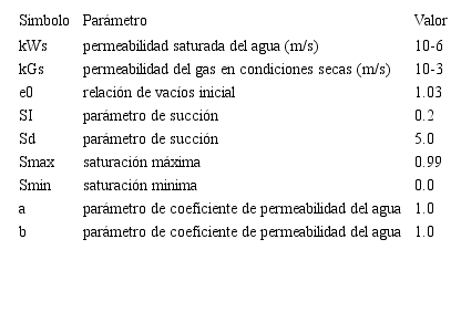 (22)Donde a y b son parámetros propios del material, y son el coeficiente de permeabilidad para el aire bajo condiciones de suelo seco y el coeficiente de permeabilidad para el agua bajo condiciones de saturación total, respectivamente. Para más detalle sobre la formulación del modelo se recomienda al lector remitirse a [20].