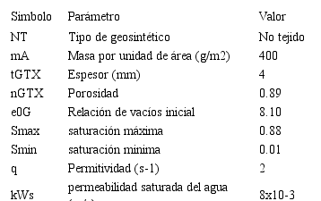 Los parámetros del suelo fueron los de una arcilla limosa empleada por Kimoto et al. [21] en simulaciones del modelo acoplado en Diques. En relación con los parámetros del geosintético se utilizaron los resultados de los ensayos realizados por Garcia et al. [11], excepto el valor de la permitividad, el cual corresponde a las propiedades de un geotextil no tejido de uso común en Colombia. Para este propósito se utilizó como fuente el catálogo de productos PAVCO (Geotextil NT 3000). Los parámetros del suelo y el geotextil se presentan en las Tablas I y II, respectivamente