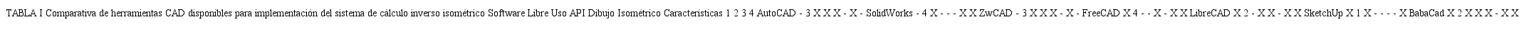 En la Tabla I se tiene una evaluación realizada por los autores de diferentes soluciones CAD disponibles. En la columna Uso, se tiene una evaluación de 1 a 5 con el tiempo de capacitación necesario (asociado con el nivel de dificultad de la herramienta, 4 es el que necesita un nivel superior de capacitación para su uso adecuado), la columna API determina si la aplicación tiene la posibilidad de ser programada o personalizada, la columna Isométrico determina si en el software es posible el dibujo en 2D con axonometría isométrica. La columna Características, determina si con la evaluación realizada es posible llegar a cumplir las características mínimas de la aplicación planteadas en el numeral anterior.