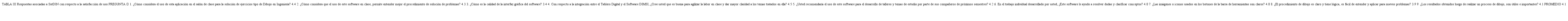 En la encuesta se realizaron 9 preguntas relacionadas directamente con el software, como se puede ver en la Tabla III. Estas preguntas van desde el uso en el salón de clase, pasando por la interfaz de usuario hasta resultados en el proceso formativo. En cada pregunta el estudiante podía proceder a calificar de 1 a 5, donde 1 es muy insatisfecho y 5 es muy satisfecho. La encuesta se realizó mediante una aplicación de internet y de manera anónima por parte de los estudiantes. El promedio total en la encuesta arrojó un 4.1/5.0.