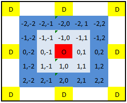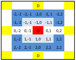Para el proyecto, se toma como base la vecindad de Moore extendida, que es una extensión de la vecindad de Von Newman. Esta vecindad contiene celdas en la diagonal, como se puede ver en la Figura 1. En el literal A del numeral 4 se describen las modificaciones a la vecindad de Moore.