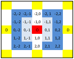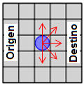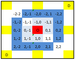 En la Figura 5 se representan todos los movimientos posibles desde la posición origen O a cada destino D en la que cada movimiento está definido en azul claro para la velocidad V1 y azul más oscuro para velocidad V2. Los valores para cada movimiento son valores de cambio en las coordenadas de los ejes de las abscisas y ordenadas del plano cartesiano. Usando estos valores, se construye la matriz de movimientos posibles para cualquier peatón MMp. Para la construcción de la matriz, se tomó como heurística que los movimientos se realizan o analizan primero de izquierda a derecha.