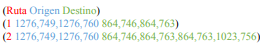 Ruta (color rojo) indica la identificación de una de las rutas del campus universitario; el origen (color azul) es un rectángulo definido por cuatro coordenadas mediante dos puntos, en esta área, el peatón puede ser generado, y, por último, el destino (color verde) tiene mínimo cuatro coordenadas para generar el área de llegar a su destino, pero puede tener más puntos (parejas de coordenadas) que determinan destinos parciales para cada peatón para esta ruta determinada. Como podemos observar, en la ruta 1 no hay destinos parciales, mientras que en la ruta 2, existen dos destinos parciales (864, 763, 1023,756) que el peatón debe transitar antes de llegar a su destino final.