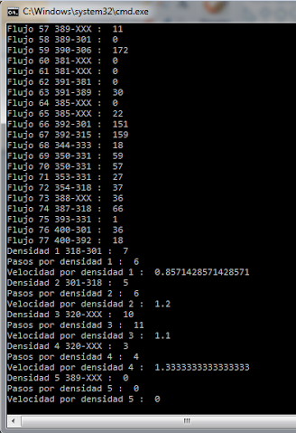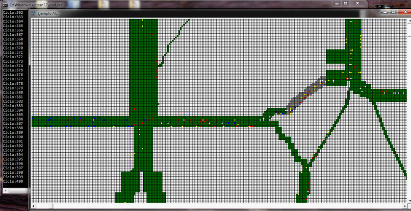 El simulador provee 2 entornos visuales, un entorno gráfico en el que se puede ver la cuadrícula y la red peatonal del campus, en la que se puede apreciar dinámicamente cómo se van generando los peatones y cómo se desplazan durante la ejecución de la simulación. Esta interfaz requiere de un equipo con muy buenas características para su funcionamiento (ver Figura 10). La segunda opción es un entorno en el que los resultados son presentados en la pantalla y se genera un archivo plano con el seguimiento de toda la ejecución (ver Figura 11); sus ventajas, con respecto a la interfaz gráfica, es que se ejecuta mucho más rápido y no requiere de un equipo con tan altas características.