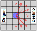 Las consideraciones para el modelo propuesto son: el alcance de la vecindad máxima es igual a 2 celdas y no se consideran todos los vecinos dentro de los movimientos posibles. Nuestro peatón no considera retroceder en su trayectoria de origen a destino, por lo que sólo realiza movimientos en un solo sentido.