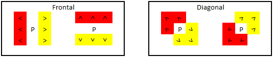 Estos movimientos los podemos clasificar en dos tipos: movimientos frontales (de arriba a abajo, abajo a arriba, izquierda a derecha y derecha a izquierda) y movimientos en diagonales (de inferior derecha a izquierda superior, izquierda superior a derecha inferior, derecha superior a izquierda inferior e izquierda inferior a derecha superior).