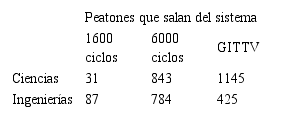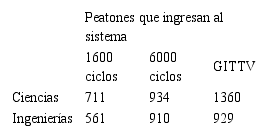 Hay que recordar que los ciclos son la unidad de tiempo de los movimientos de cada peatón y son equivalentes a un paso de un peatón en el sistema. En la columna GITTV están todos los peatones que salieron e ingresaron en el intervalo del mediodía según los resultados presentados en [16] y 6000 ciclos serían un equivalente a 100 minutos aproximadamente.