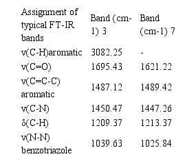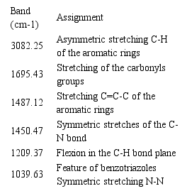 The analysis of the infrared (IR) spectrum of compound 3 shows that, in comparison of IR spectra of ligand with benzotriazole, the ν(N–H) characteristic band at 3400 cm-1 of benzotriazole is absent. The characteristic band of carbonyls groups ν(C=O) was observed at 1695.43 cm-1; the tension band of the ν(C–N) bond appears at 1450.47 cm-1, related to the bond between benzotriazole molecules and the central ring of isophthaloyl.