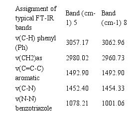 Based on the above, the bands show a slight displacement, with exception of the characteristic band of the N-N symmetric stretch in benzotriazole of ligand that pronounced towards 1078.21 cm-1. This can be associated with the coordination of ligand to the metallic center of palladium through the nitrogenous part of ligand. This behavior is much more marked for this complex 8 than for 7, where the shift of this band was much lower.