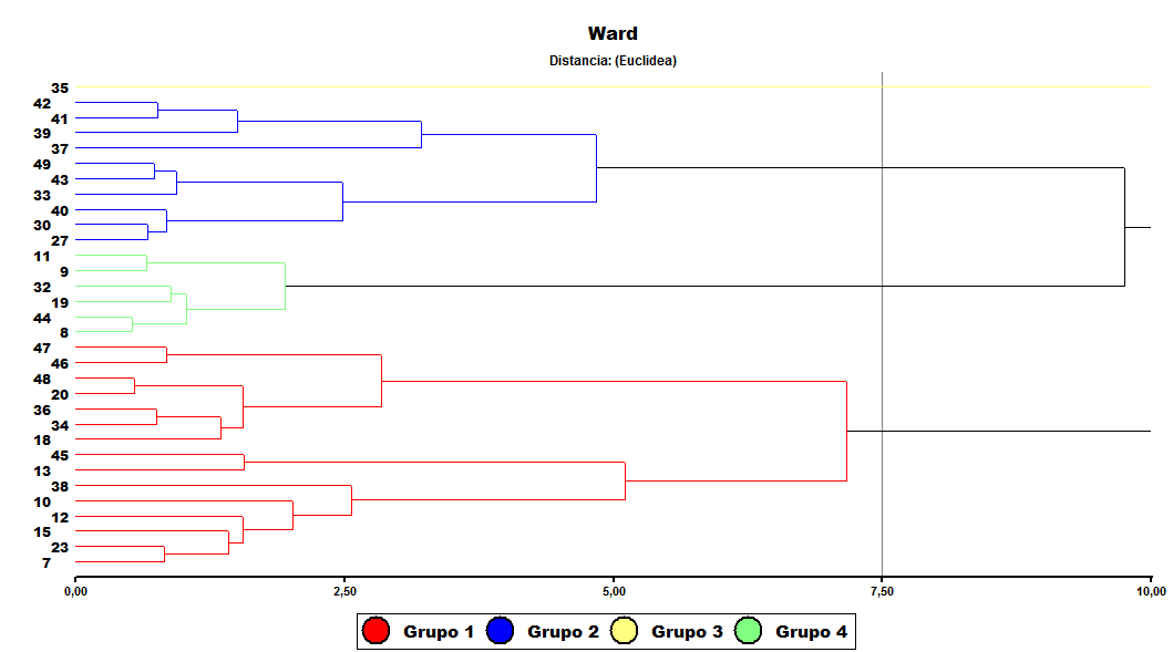 The analysis of conglomerates by the Ward method and the Euclidean distance made for the Hematological parameters in Nilotic Tilapia (Oreochromis niloticus) individuals cultivated in Santo Domingo farm, Florencia- Caquetá, showed that with a cofenetic distance of 0.54 for morphometric analyzes evidenced the formation of four groups; group number one (1) with 15 individuals who presented the highest values, group two (2) and three (3) with average values; while group number four (4) presented the lowest values (Figure 1).