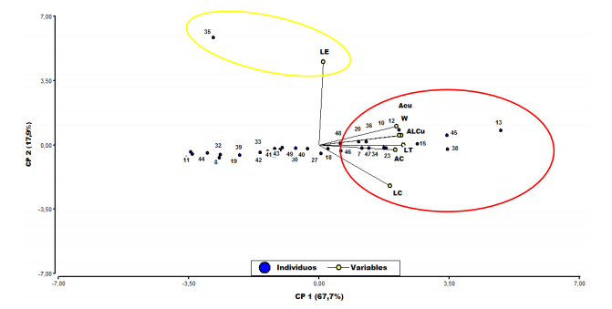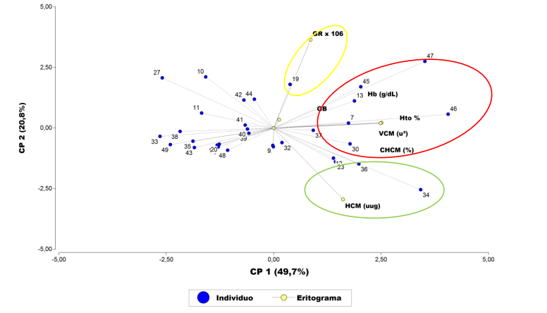 According to Figure 3, the first main component (MC1) with a contribution of 49.7% of the variability organized 10 individuals that presented the highest values of GB, Hb, Hto, VCM, HCM and CHCM; while the second main component (MC2) with a contribution of 20.8% Organized the GR with 3 individuals who presented the highest values for these variables (Figure 3).