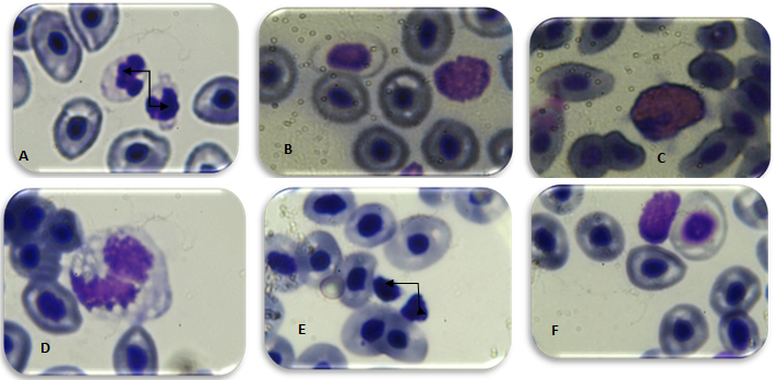The primordial functions of eosinophils are associated with the antiparasitic response, modulation of allergic reactions and phagocytosis as described [17] - [4] and [30], in our investigation we found lobed cells, the eccentric and lobed nucleus occupying a fourth part of the whole cell, and the cytoplasm has large granules (orange, purple) coinciding with [17] and according to [3], these cells are very rare for this species, i. e. they only reach a number lower than 5% of the total leukocytes, for example the average of eosinophils in this investigation was 4.3%, a high value for such species.