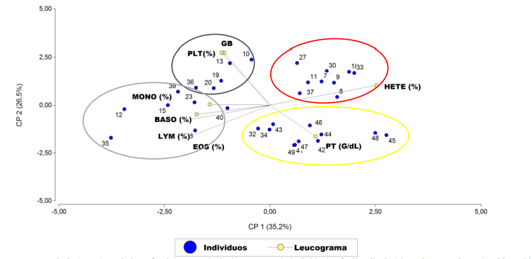 According to Figure 5, the first main component (MP1) with a contribution of 35.2% of the variability organized 9 individuals who presented the highest values of HETE (%) to the positive end of such component; at the negative end it organizes 7 individuals with the variables MONO (%), BASO (%), LYM (%) and EOS (%). While the second main component (MP2) with a contribution of 26.5% organized the GB and PLT with 5 individuals who presented the highest values for these variables, while PT to the negative end of such component with 12 individuals (Figure 5).