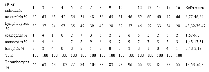 According to [4] they include thrombocytes in the differential count of leukocytes, for the investigation it was taken as an independent series, coinciding with other authors such as [36]-[38], since the reagent of Natt and Herrick allowed in a same dilution to identify leukocytes and thrombocytes for their total count, noting that when blood is collected with anticoagulant, the thrombocytes exhibit an oval shape as obtained in this investigation