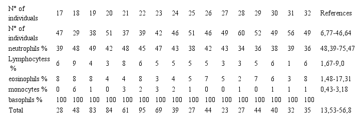 According to the authors mentioned above, their representation only reached 2.5% as the maximum value for the countdown of white ones; however for [23] these cells were not observed and stipulate that the presence of these granulocytes may be related to diseases such as eosinophilia, since under normal conditions (healthy fish) they are scarce or absent. Similar data reported by [31] show that this type of cells was not observed in work performed in O. niloticus, and for other species such as Ictalurus punctatus, these values coincide with our study [9].