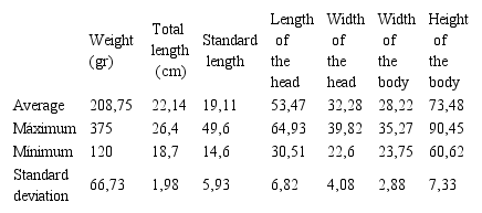 The individuals studied had an average weight of 208.75 ± 66.73 and an average total length of 22.14 ± 1.98 presented in Table I coinciding with the values recorded by [4], which in turn were similar with those reported by [19].