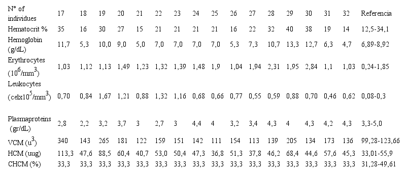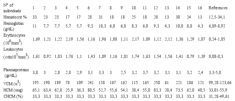 Once the blood studies were carried out, it was possible to show that two individuals had a Microcytoma Normochromic anemia, since their value of VCM is below the range, in addition to that 16 individuals presented Normocromic Normocitica anemia. These situations can be rooted in overpopulation in the environment, which generates a decrease in oxygen levels (apoxia) and therefore stress generates a lack of appetite in individuals, which triggers anemia. On the other hand, when performing the analysis of the leucogram, some fish presented a leukopenia with lymphopenia and thrombocytosis, which indicates an immune system response to a pathogenic agent, which is why it is believed to be a bacterial septicemia.