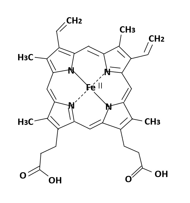Hematina + NaOH + Glucosa + Piridina Piridina Ferroprotoporfirinica (cristales de Hemocromògeno). En la fig.2 se ilustra la estructura molecular de la piridina Ferroprotoporfirinica.