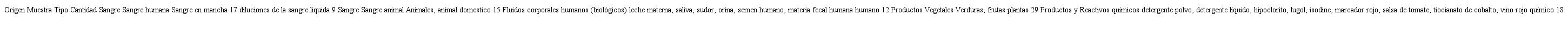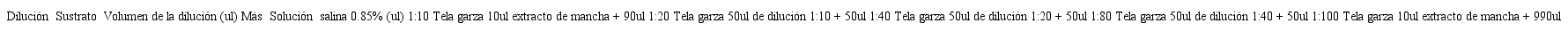 En la Tabla 2 se muestran las diluciones de sangre humana en mancha empleadas, desde 1:10 hasta 1:100 partiendo de un extracto de 0.5cm x 0.5 cm con 20ul de solución salina 0.85%.