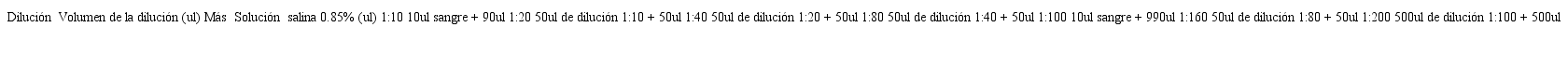 En la tabla 3 se listan las diluciones en sangre líquida realizada a partir de sangre total anticuagulada con citrato de sodio.