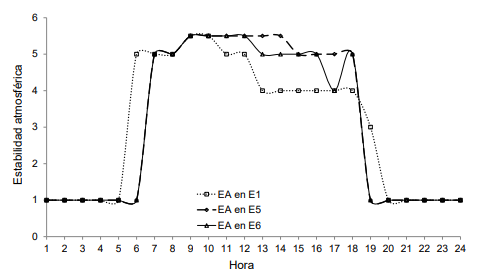 Los análisis de estabilidad atmosférica (EA) fueron realizados a partir de los registros de velocidad del viento y radiación solar de las estaciones E1, E5 y E6. Estas estaciones cubrieron una distancia de 23,9 km en línea recta, de los 33 km que posee la ciudad de norte a sur. Las estaciones E2, E3 y E4 estuvieron localizadas entre las estaciones E1 y E6. La Figura 1 presenta la condición promedio horaria de EA durante el período de investigación a partir de la escala cuantitativa adoptada en el presente estudio. Se observó que la condición de EA dominante entre las 6 y 18 horas fue ligeramente inestable (EA = 4; frecuencia para 24 h, f-24 h = 19,5%), inestable (EA = 5; f-24 h = 24,5%) e inestable (EA = 5; f-24 h = 22,7%) para las estaciones E1, E5 y E6, respectivamente; la condición de EA dominante entre las 18 y 6 horas fue estable (EA = 1): 35,0% (f-24 h), 49,2% (f-24 h) y 50,0% (f-24 h), respectivamente.