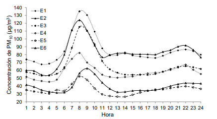 En promedio, se observó en todas las estaciones de monitoreo un incremento en la concentración horaria de PM10 a partir de las 5 a.m., disminuyendo entre las 11 a.m. y 12 p.m. Los picos en las concentraciones de PM10 se registraron entre las 8 y 9 a.m. Los resultados mostraron una tendencia similar en las concentraciones horarias de PM10 para todas las estaciones durante el periodo de estudio (Figura 2). Al respecto, un análisis de correlación lineal entre todas las estaciones de monitoreo mostró relaciones positivas entre medias y muy fuertes (r-Pearson entre 0,62 y 0,98). De esta manera, los resultados sugirieron un comportamiento uniforme en los ciclos horarios de las fuentes de emisión fijas y móviles de PM10 en toda el área de investigación. Se consideró esta misma tendencia para las series de tiempo diarias de PM10 generadas en este estudio, debido a que las concentraciones horarias de PM10 fueron agregadas diariamente para el análisis ARIMA (media móvil para 24 h).