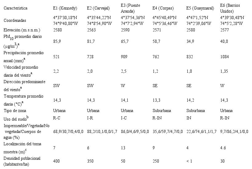 La investigación se desarrolló en una ciudad latinoamericana de elevada altitud (Bogotá, Colombia), localizada sobre la cordillera de los Andes (04°36′35″N-74°04′54″W) a una altitud promedio de 2600 m.s.n.m. Las seis estaciones automáticas de monitoreo se ubicaron en las localidades de Kennedy (E1 y E2), Puente Aranda (E3), Suba (E4 y E5), y Barrios Unidos (E6). El clima tropical de montaña (clima frio) de los lugares de investigación se caracterizó por presentar durante el período de muestreo una temperatura promedio diaria entre 13,3 y 14,3 °C, con variaciones horarias entre 7,2 y 19 °C. La Tabla 1 presenta las principales características de las zonas de localización de cada estación de monitoreo. Todas las estaciones de monitoreo contaron con instrumentos de medición para PM10, temperatura, y dirección y velocidad del viento. Adicionalmente, las estaciones E1, E5 y E6 fueron proveídas con instrumentos para la medición de radiación solar. Las áreas de influencia de las estaciones seleccionadas no experimentaron cambios significativos en la cobertura superficial durante el periodo de investigación, el cual estuvo comprendido entre los años 2007-2012.
