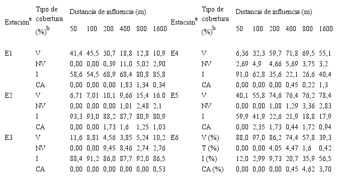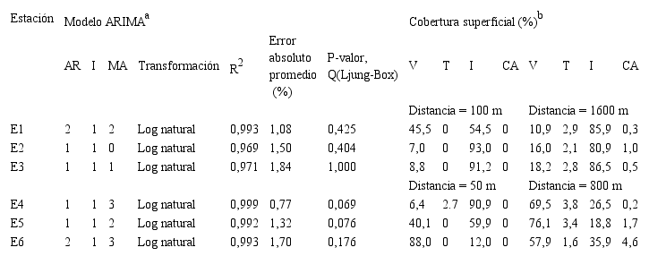 La tabla 2 presenta la variación espacial en el tipo de cobertura urbana para las distancias de influencia definidas sobre cada estación de monitoreo. Existieron tres estaciones con predominio de cobertura impermeable: E1, E2 y E3. Este tipo de cobertura representó entre 54,5-85,8%, 80,9-93,3% y 86,0-92,0% del área, respectivamente; a partir de las distancias de influencia establecidas para cada estación de monitoreo (entre 50-1600 m). El orden de precedencia para este tipo de cobertura urbana en las estaciones de monitoreo fue el siguiente: E3 > E2 > E1. Por otro lado, existieron tres estaciones con predominio de cobertura vegetada: E4, E5 y E6; este tipo de cobertura representó entre 6,4-71,8%, 40,1-78,4%, y 39,3-97,0% del área, respectivamente. El orden de precedencia para este tipo de cobertura en las estaciones de monitoreo fue el siguiente: E6 > E5 > E4. De esta manera, existieron tres estaciones de monitoreo con predominio de cobertura impermeable y tres estaciones con predominio de cobertura vegetada para analizar su influencia sobre los modelos ARIMA desarrollados.