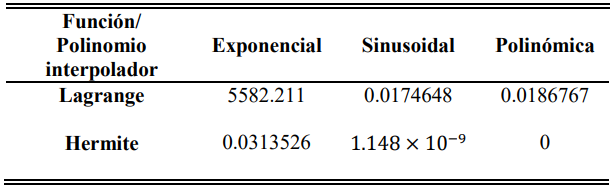 The results obtained from the interpolating polynomials of Lagrange and Hermite quickly show that the Hermite polynomial will always be of greater degree than the Lagrange polynomial, a fact that represents a greater use of computational memory, however, in Table 5 of the EMC, the efficiency of this computational cost, which is a result of zero error and almost zero in some approximations made.