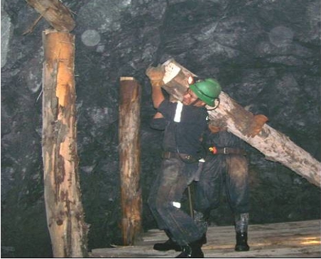 La tarea sostenimiento, consiste en colocar un soporte estructural que permita recuperar el equilibrio perdido en la roca, producto de la extracción del material minero. De esta forma se protegen a los trabajadores de posibles accidentes y a los equipos de posibles daños. En la Fig. 2 se muestran los trabajadores mineros durante la realización de la tarea sostenimiento con cuadros de madera. El procedimiento de trabajo es el siguiente: