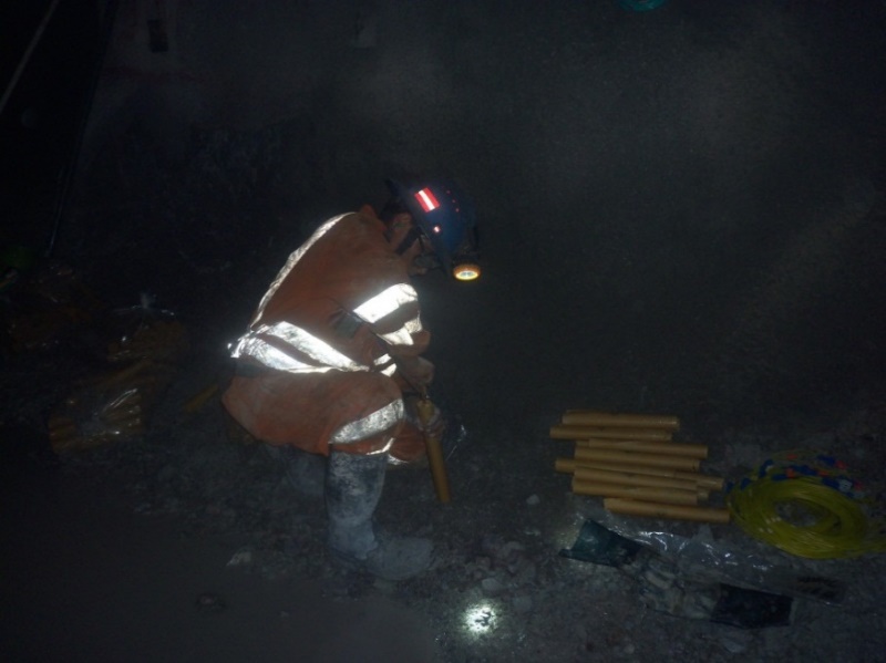 La actividad de voladura consiste en el daño de la roca, es decir, la alteración de sus parámetros geomecánicos y la consiguiente disminución de sus propiedades resistivas. En la Fig. 4 se muestra un trabajador minero preparando la carga explosiva para la voladura. El procedimiento de trabajo es el siguiente:
