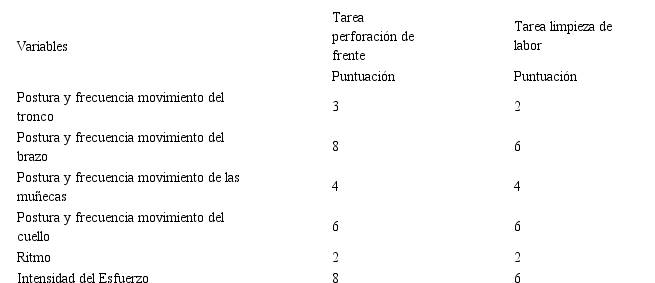 Los resultados de la evaluación con el método ERIN para las tareas perforación de frente y limpieza de labor, indican un nivel de riesgo alto, y por tanto la necesidad de realizar cambios en un breve periodo de tiempo en ambas tareas. Las puntuaciones de cada variable se comportaron de forma similar en las dos tareas, obteniéndose valores altos para las variables brazo, cuello e intensidad del esfuerzo.