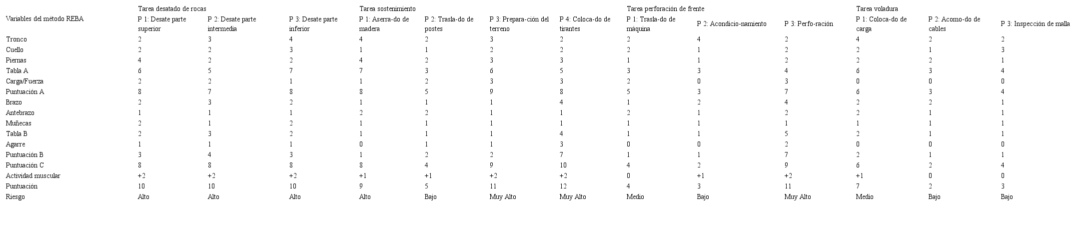 En total fueron evaluadas con el método REBA 13 posturas críticas y comunes de las tareas: desatado de rocas, sostenimiento, perforación de frente y voladura. De estas, tres presentaron un riesgo muy alto, cuatro un riesgo alto, dos un riesgo medio y cuatro un riesgo bajo. Las tareas desatado de rocas y sostenimiento presentaron, en general, los niveles de riesgo más altos y la tarea voladura los niveles de riesgo más bajos.