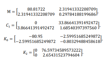 dan información sobre el tipo de movimiento. En efecto, valores propios con parte real positiva corresponden a movimientos inestables; con parte real negativa, a movimientos estables asintóticamente y valores propios imaginarios corresponden a movimientos oscilatorios. En particular, las matrices M,C1,Ko y k2 son las siguientes,