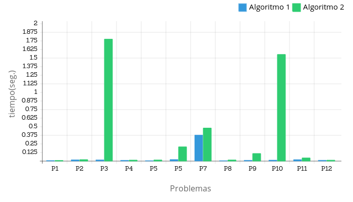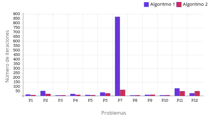 En general, se puede apreciar que el Algoritmo 2 tiene un mejor comportamiento que el Algoritmo, en cuanto al número de iteraciones se refiere. Vale la pena mencionar que, para el problema P7 el número de iteraciones con el Algoritmo 1 es muy alto comparado con el Algoritmo 2, pero su costo computacional es menor (ver Fig. 1).