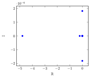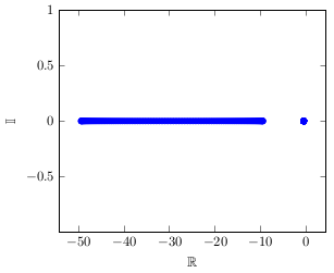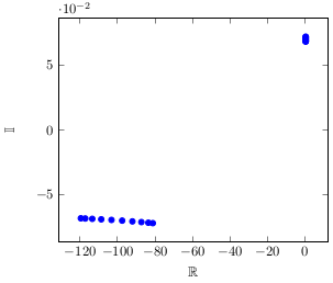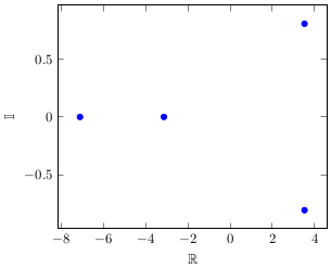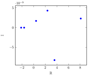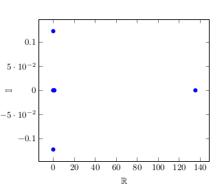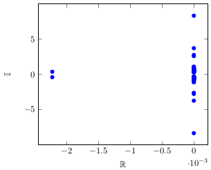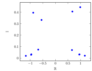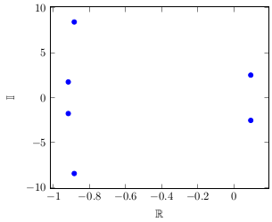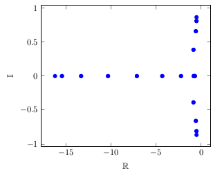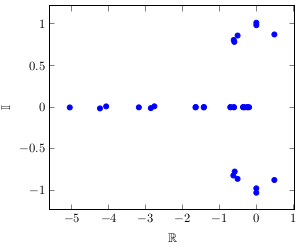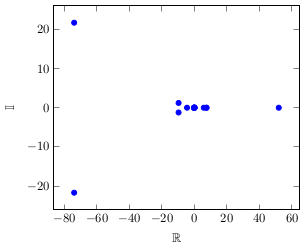 Finalmente, se presentan las gráficas de la ubicación, en el plano complejo, de los valores propios obtenidos por el algoritmo híbrido propuesto, para cada uno de los problemas Fig.(4.5.6.7.8.9.10.11.12,13,14,15).