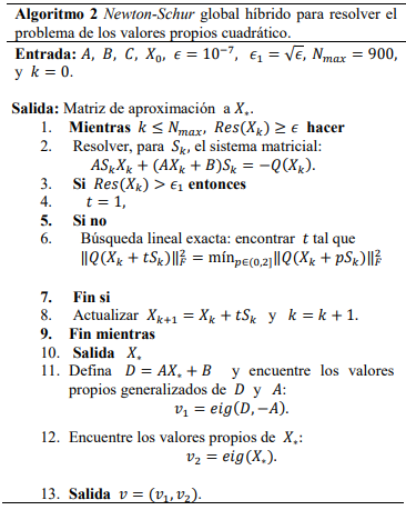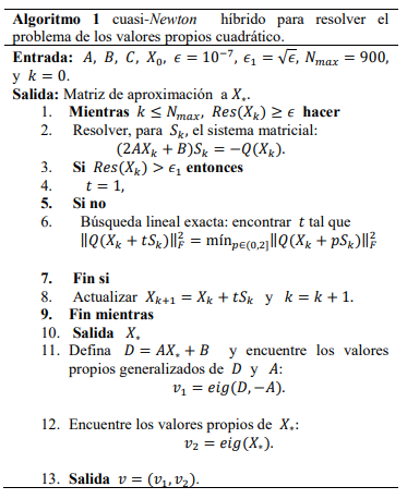 En esta sección, se presenta un algoritmo híbrido para resolver el problema de los valores propios cuadráticos, en el cual combina el algoritmo tipo cuasi-Newton globalizado propuesto en [15] para resolver la ecuación cuadrática matricial con un algoritmo de Matlab que calcula valores propios. El algoritmo híbrido propuesto (Algoritmo 1), es el siguiente.
