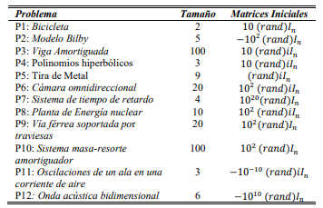 La Tabla I, contiene los problemas considerados, su tamaño y las matrices iniciales (aleatorias), en cada caso.
