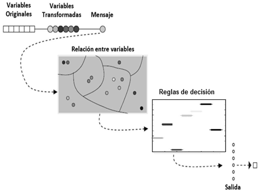 Las variables originales son los datos recolectados y etiquetados en el estudio descriptivo. Estos datos sufren un proceso de agrupación, ya que para hacer uso de la TI en el análisis de un sistema las variables deben ser categóricas. Al ser las variables de este estudio de tipo numéricas, puesto que provienen de los sensores, se hace un proceso de transformación a categóricas, además por la cantidad de datos que se tienen debe realizarse una reducción del número de éstos. Se hace uso de la técnica Menor Pérdida de Información (LIL, por sus siglas en inglés). Aunque se presenta pérdida de información con esta operación, LIL permite tener en cuenta la variable dependiente para encontrar los puntos de corte, es decir considera el efecto que la partición provoca sobre la variable de salida, de esta forma se tienen categorías que revelan la máxima cantidad de información sobre la salida. La reducción de datos con la determinación del número de categorías obtiene una representación reducida del conjunto de datos menor en volumen pero que produce los mismos resultados analíticos.