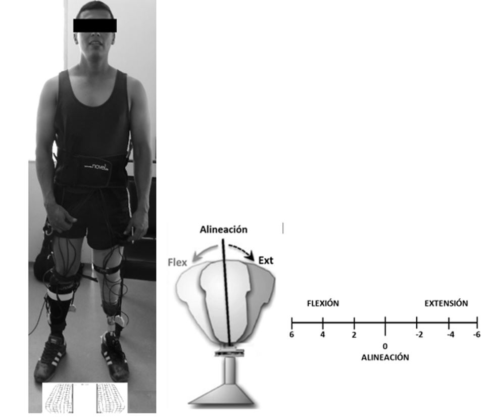 La medición de rangos articulares se realizó con el Sistema de Laboratorio de Adquisición de Datos, tipo No. LS900 de la empresa Biometrics Ltd®, que consta de goniómetros digitales de doble eje, un sistema de adquisición de datos (referencia DLK900), software de adquisición y tratamiento de señales DataLINK DLK900 versión software 5.0 [11]. La medición de fuerza plantar se realizó con el sistema Pedar®, consiste en plantillas instrumentadas que permiten obtener información de la fuerza que interactúa entre el pie y la suela del zapato, así como la medición de la distribución de la fuerza de contacto y la ubicación del centro de presión (COP); este sistema tiene 198 sensores capacitivos (99 en cada plantilla), software y sistema de visualización, es producido por la empresa Novel [12].