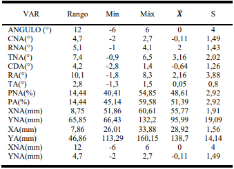 Se tienen 5600 datos de cada variable. VAR es la variable medida, es el estimado de la media, S la desviación estándar, ANGULO ubicación angular del encaje de la prótesis, C ángulo de la cadera, R ángulo de la rodilla, T ángulo del tobillo, P porcentaje de soporte de peso corporal, X ubicación COP eje medial-lateral, Y ubicación COP eje antero-posterior, A ipsilateral, NA contralateral.
