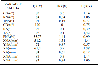 Resumen de los datos infométricos de las variables. Los valores mostrados son porcentajes de relación (información mutua I(X:Y)), el ruido (H(Y|X)) y la equivocación (H(X|Y)), entre la variable de entrada ANGULO y cada salida.